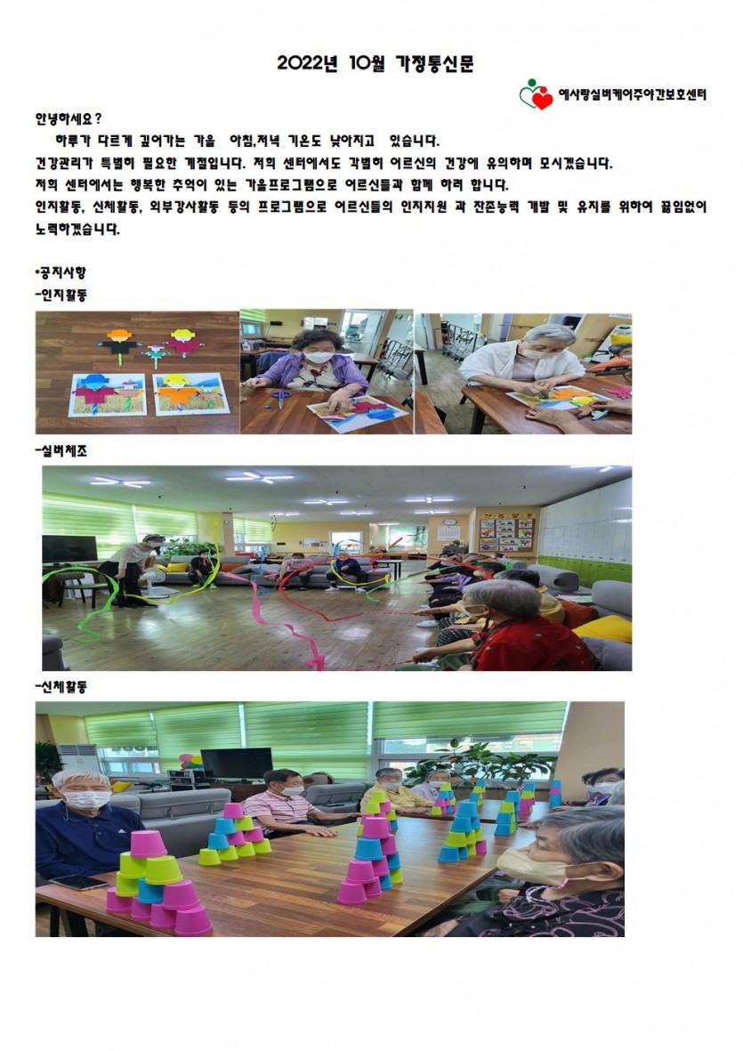예사랑 실버케어 주야간 보호센터 10월 가정통신문